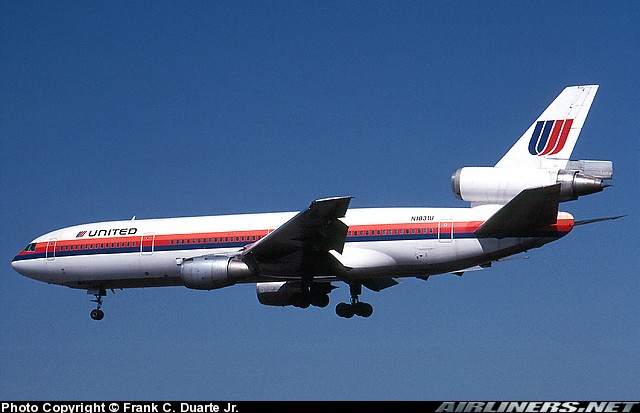 United Airlines McDonnell Douglas DC-10-10, N1831U, is shown approaching San Diego in February 1983 wearing the