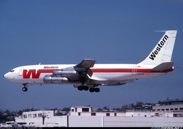 Western Airlines Boeing 720-047B, is shown arriving at San Diego in April 1977.