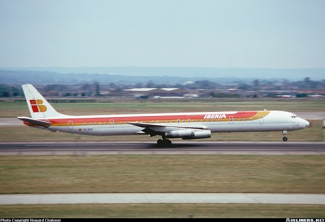 Ibera McDonnell Douglas DC-8-63, EC-BSE, is shown at London Heathrow on July 19, 1978.