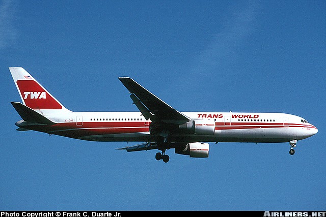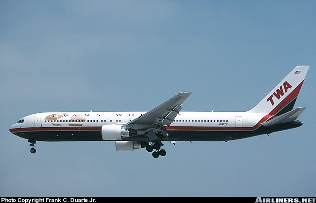 Trans World Airlines Boeing 767-3Q8, N636TW, is shown arriving at Los Angeles International Airport in July 2000